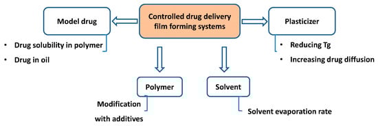 Generally, the formulations of FFSs contain a mixture of drug, excipients (polymers and plasticizers or additives such as penetration enhancers) and volatile solvents that can transform a liquid into a film on the skin surface after application. Therefore, several factors, such as the physicochemical properties of the drugs, the polymer and the plasticizer types and concentrations, the role of additives in formulations and the solvent evaporation will define the rate of drug release through the skin by modulation of drug saturation [33,59,60,61,62,63,64,65,66,67,68]. Therefore, these factors will be the focus of investigation for controlled drug release FFSs (Figure 3).