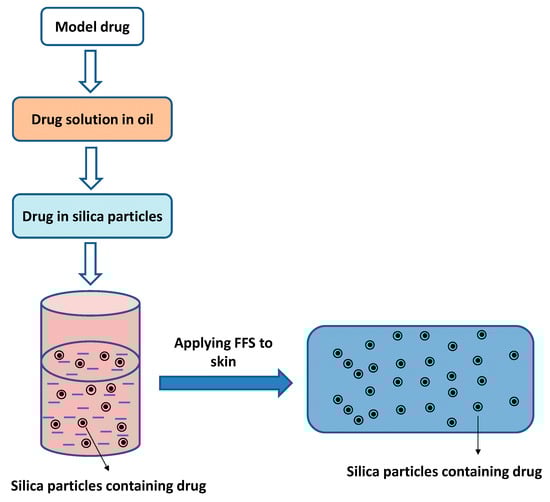 To sustain drug release, Rouven et al. suggested dissolving model drugs in refined castor oil and then loading the drugs on the silica particles before incorporating them into film-forming polymer solution [58,71] (Figure 4). The percentage of the drug in oil was 6%, and the ratio between the drug solution and silica particles was 3:2, which was mixed with the plasticized Eudragit® RS 30D for creating the formulation containing 0.9% drug [71]. The results of ex vivo skin permeation, penetration and in vivo skin tolerability from these studies suggested prolonged drug release and no skin irritation for healthy volunteers [71].