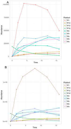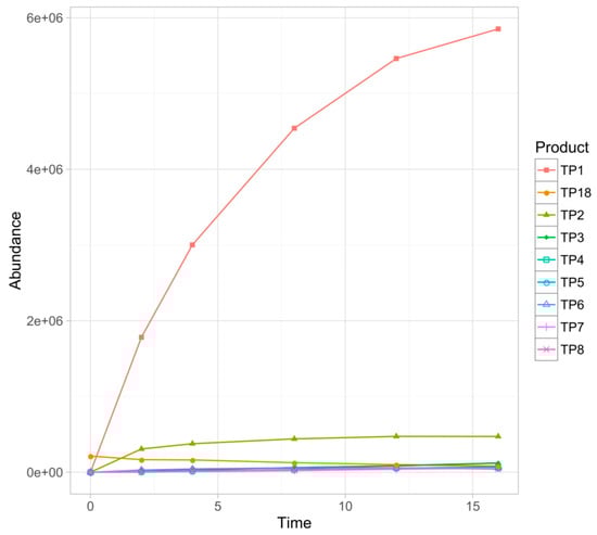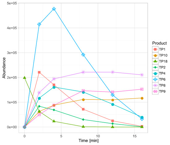 Overall, eighteen TPs were formed in the studied phototransformation processes, and their structures were elucidated on the basis of the obtained MS/MS spectra (Table 3). Half of the identified TPs were formed during all the experiments, however, in some cases only at a trace level. The remaining TPs were absent at least in one sample. The evolution profiles of the TPs formed in the experiments are presented in Figure 2, Figure 3, Figure 4, Figure 5 and Figure 6 (TPs detected at a trace level are not shown).
