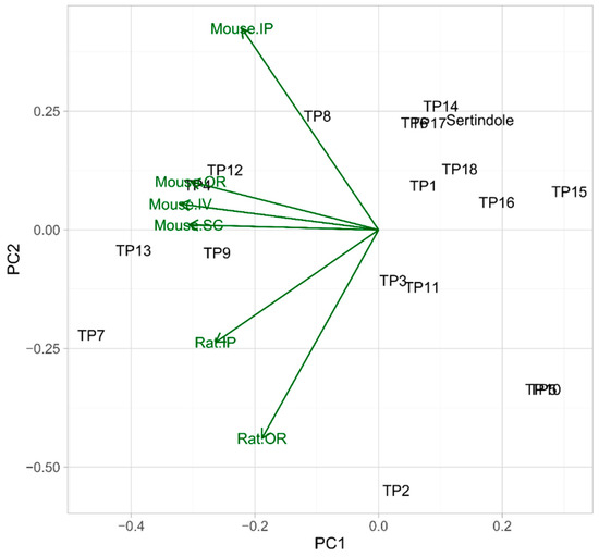 In silico toxicity to rodents of sertindole as well as its TPs were assessed with the use of ACD/Percepta 14.0.0 (ACD/Labs, 2015 Release). Six toxicity categories were applied: two for rats—oral (OR) and intraperitoneal (IP) and four for mice—oral (OR), intravenous (IV), subcutaneous (SC), intraperitoneal (IP). The calculated LD50 values (expressed in logmg kg−1) are presented in Table S3. In order to visualize the relationships between the toxicity of the analyzed compounds, a principal component analysis was performed. The first principal component (PC1) explained 65.85% of the total variability and the second principal component (PC2)—19.78%. As shown in Figure 9 (toxicity decreases in parallel with increasing LD50 values), TP1, TP6, TP14–TP18, and sertindole possessed very similar toxicity to rodents. TP4, TP8, TP9, TP12, and TP13 were generally less toxic for all the models (in the case of TP8—with the exception of the rat oral model which predicted almost the same toxicity). TP3, TP11, and especially TP2 were less toxic for the rat models and possessed very similar toxicity to mice. TP7 should be considered as the least toxic amongst the studied compounds, especially to rats. TP5 and TP10 were more toxic to mice than the parent compound, however, on the other hand, their toxicity to rats was significantly lower.
