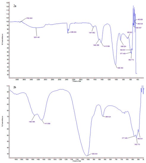 The formation of CA from the lyophilized sample was confirmed via FT-IR spectroscopy. The IR spectra was collected between 400–3800 cm−1 (Figure 2). Three main chemical groups synthesized are hydroxyl (OH−), carbonate ion (CO3−), and phosphate ion (PO43−). From the IR spectrum, the OH− stretch can be observed from 3727 to 2946, 1658, and 675 cm−1. The peaks that represent CO3− can be seen at 1480, 1415, and 866 cm−1. The peaks that represent PO43− can be seen at 1008, 585, 567, and 540 cm−1 while peaks within 467 cm−1 represent weak PO43−. Figure 2b shows the magnified image of the essential peaks of CO3− and PO43−.