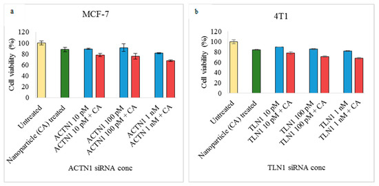 In order to see the optimum siRNA concentration for cell transfections, the MTT assay was performed where two different cell adhesion siRNAs were used in MCF-7 and 4T1 cells. Three different concentrations of siRNAs were used (10 pM, 100 pM, and 1 nM) with/without CA as a delivery vehicle. From Figure 3a,b, we can see that, compared to free ACTN1 and TLN1 siRNAs, siRNAs bound to CA nanoparticles caused more reduction in cell viability. Furthermore, the reduction in cell viability was higher at a 1-nM concentration of siRNA (~67%).