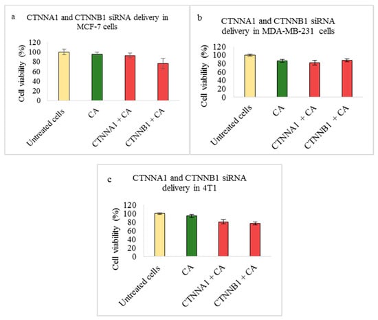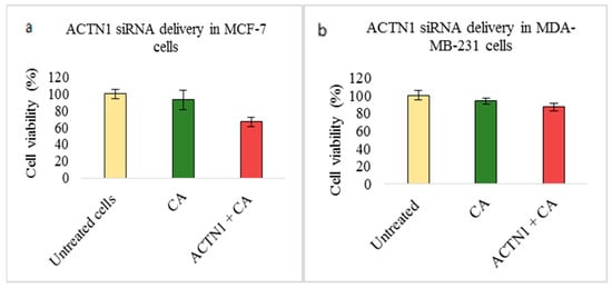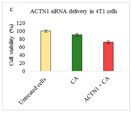 Lastly, transfection of MCF-7 and 4T1 cells with ACTN1 siRNA loaded with CA nanoparticles also caused a decrease in cell viability. The viability after 48 h was ~67% in MCF-7 cells (Figure 8a) and ~72% in 4T1 cells (Figure 8c). However, in MDA-MB-231 cells, the cell viability did not show such a high reduction compared to the CA control (Figure 8b).