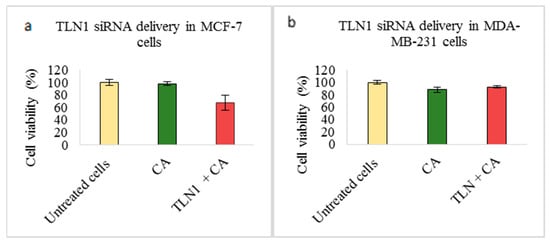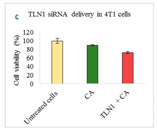 On the other hand, transfection of TLN1 siRNA loaded with CA nanoparticles caused reduced cellular viability by ~67% in MCF-7 cells (Figure 5a) and ~72% in 4T1 cells (Figure 5c). However, in MDA-MB-231 cells, no reduction in cell viability was observed (Figure 5b).
