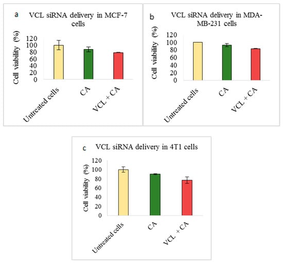 Transfection of VCL siRNA loaded with CA nanoparticles caused no reduction in MCF-7 cell viability compared to a CA nanoparticle treated control (Figure 6a). On the other hand, in 4T1 cells, a mild reduction to ~77% (Figure 6c) could be seen. In MDA-MB-231, ~83% cell viability was observed (Figure 6b).