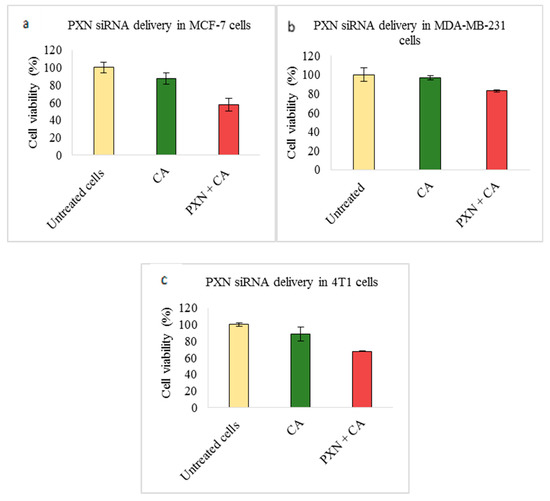 Targeting PXN via transfection of CA loaded PXN siRNA caused significant reduction in all three cell lines. The viability greatly reduced in MCF-7 (~57%) and 4T1 (67%) cells (Figure 7a,c, respectively). In MDA-MB-231 cells, viability reduction to ~83% was seen (Figure 7b).