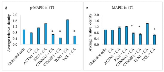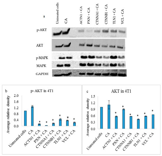 The Western blot analysis showed reduced expression of both p-AKT and total AKT proteins, upon 48 h transfection targeting ACTN1, PXN, and CTNNA1 via siRNAs loaded with CA nanoparticles (Figure 9). The reduction was significantly different (p < 0.05) compared to CA (Figure 9b,c). However, it was only CTNNA1, CTNNB1, and VCL siRNA transfection that caused low band intensities for p-MAPK and total MAPK (Figure 8a) with p < 0.05 (Figure 9d,e).