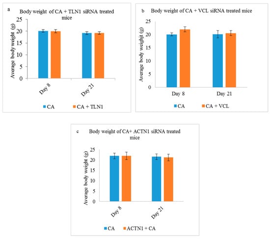 The average body weights for mice in all the treatment and control groups were monitored at the interval of every two days, and it was observed that the weight in all the groups remained unchanged (approximately 20 g). Data is shown, in this case, for treatments with CA loaded TLN1 (Figure 10a), VCL (Figure 10b), and ACTN1 (Figure 10c) siRNAs.