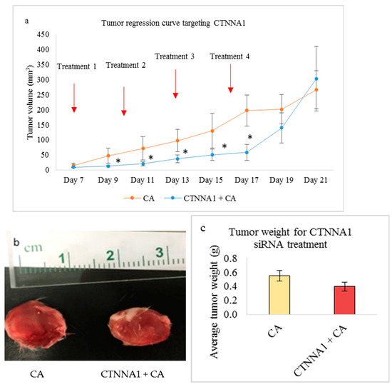 In vivo tumor regression showed reduced tumor volume in the CA-CTNNA1 siRNA complex. The reduced tumor volume was observed after the first dose of treatment (Figure 11a). The highest fold (3.75) reduction was observed on Day 9 (Table 3). * represents a significant reduction with p < 0.05, which was observed from Day 9 until Day 17 of treatment (Figure 11a). Post day 17, a significant increase in tumor volume was observed, which, on Day 21, was higher than the CA control. Figure 11b shows an excised tumor of the CA-CTNNA1 siRNA treated group vs. the CA treated group, while Figure 11c shows tumor weight at the end of treatment. The tumor appears to be of the same size and weight compared to CA.