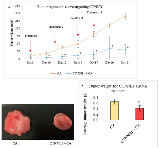 On the other hand, delivery of the CA-CTNNB1 siRNA complex caused a significant reduction (p < 0.05) at all the time points of measurement after injection of the first dose of treatment. Figure 12a shows that the tumor regression curve was almost consistent with no increase until Day 17. The tumor fold reduction in comparison to the CA control (4.80) was highest on Day 10 and Day 21 (Table 4). Figure 12b shows the reduced tumor at the end of the treatment compared to the CA group and decreased tumor weight of ~0.41 g (Figure 12c), which is significantly lesser (p < 0.05) when compared to CA.