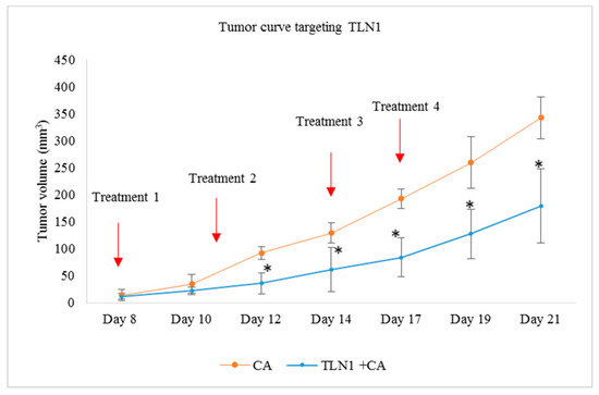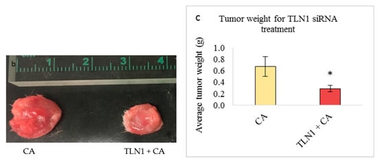 Treatment effect of CA bound siRNA against TLN1 genes in a 4T1 induced tumor mice model. 4T1 cells were injected subcutaneously in the mammary pad of mice. After a palpable tumor, mice were treated intravenously through tail vein injection with 100 μL of CA-TLN1 siRNA formed in 4 μL of 1 M CaCl2. Four doses of treatment were given on Day 8, Day 11, Day 14, and Day 17. Five mice were used per group and data was represented as mean ± SD. (a) Tumor outgrowth of mice treated with CA-TLN1 values are significant for * representing p < 0.05 compared to the CA control. (b) Excised tumor of the CA-TLN1 siRNA group compared to CA at the end of the treatment. (c) Tumor weight of the treated group vs. the CA treated group with * representing p < 0.05 compared to the control.