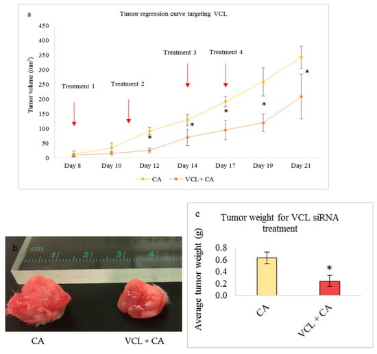 Treatment effect of CA bound siRNA against VCL genes in a 4T1 induced tumor mice model. 4T1 cells were injected subcutaneously in the mammary pad of mice. After a palpable tumor, mice were treated intravenously through tail vein injection with 100 μL of CA-VCL siRNA formed in 4 μL of 1 M CaCl2. Four doses of treatment were given on Day 8, Day 11, Day 14, and Day 17. Five mice were used per group and data was represented as mean ± SD. (a) Tumor outgrowth of mice treated with CA-VCL values are significant for * representing p < 0.05 compared to the CA control. (b) Excised tumor of the CA-VCL siRNA group compared to CA at the end of the treatment. (c) Tumor weight of the treated group vs. the CA-treated group with * representing p < 0.05 compared to the control.