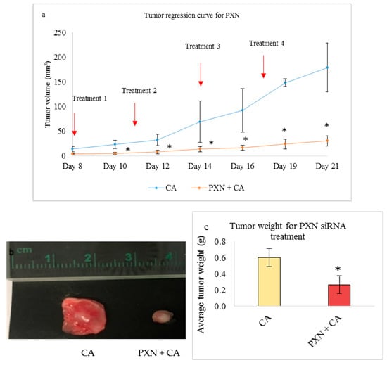 Treatment effect of CA bound siRNA against PXN genes in a 4T1 induced tumor mice model. 4T1 cells were injected subcutaneously in the mammary pad of mice. After a palpable tumor, mice were treated intravenously through tail vein injection with 100 μL of CA-PXN siRNA formed in 4 μL of 1 M CaCl2. Four doses of treatment were given on Day 8, Day 11, Day 14, and Day 17. Five mice were used per group and data was represented as mean ± SD. (a) Tumor outgrowth of mice treated with CA-PXN values are significant for * representing p < 0.05 compared to the CA control. (b) Excised tumor of the CA-PXN siRNA group was compared to CA at the end of the treatment. (c) Tumor weight of the treated group vs. the CA treated group with * representing p < 0.05 compared to the control.