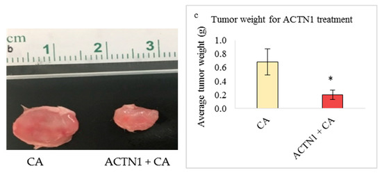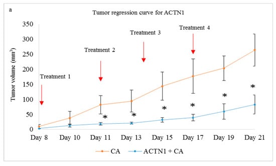 Intracellular delivery of the actinin-1 (ACTN1) complexed with CA in breast cancer cells showed a significant reduction of viability in MCF-7 and 4T1 cell lines, while, in MDA-MB-231, no such effect was observed. The cell viability was reduced to ~66% in MCF-7 (Figure 8a), ~87% in MDA-MB-231 (Figure 8b), and ~ 71% in 4T1 cells (Figure 8c). The cytotoxicity was ~26% in MCF-7 cells, ~6% in MDA-MB-231 cells, and ~18% in 4T1 cells (Table 2). This indicates the important role of this gene in proliferation of breast cancer cells. The slight decrease in viability of MDA-MB-231 could be due to higher invasive properties of these cells. Furthermore, upregulated α-Actinin-4 might also enhance the cell viability, as this form of actinin was shown to enhance cell proliferation in various cancers [57]. The Western blot showed significantly reduced expression in phosphorylated and total AKT levels upon transfection of 4T1 cells (Figure 9), which are upregulated in overexpressed ACTN1 cells. No reduction in p-MAPK and MAPK could either be due to the presence of α-Actinin-4, which could activate the ERK/MAPK pathway, or due to cross talks of this pathway with other biological cell molecules, cell receptors, and transcription factors. In addition, both actinin forms have been found to be linked with EGFR, where EGFR causes stimulation of actinin phosphorylation (actinin-4 more than actinin-1), which activates the cascade of signaling pathways [67]. An in vivo tumor regression result was correlated to the cell viability data obtained in 4T1 cells and showed a highly significant reduction in tumor volume upon delivery of ACTN1-CA complex (Figure 16a) compared to the CA control. The tumor growth curve for the treatment group was almost constant until Day 17 of treatment, which indicates controlled tumor growth, and, after Day 17, a slight increase was observed. The tumor volume did not increase more than ~80 mm3, with tumor weight not exceeding 0.24 g (Figure 16c). In tumors, α-Actinin-1 serves as an adapter protein, which, under pressure, redistributes to membranes where it facilitates recruitment of the Src protein to β1-integrin-associated focal adhesion, while the other unit, α-Actinin-4, has been focused upon for its tumorigenesis role in breast cancer. ACTN1 still remains a potential molecule to be explored for its contribution toward the tumor burden. Therefore, by targeting this protein, it could provide a therapeutic model for inhibition of pressure stimulated tumor cell adhesions and control of the tumor growth and metastasis [11,68,69,70,71].