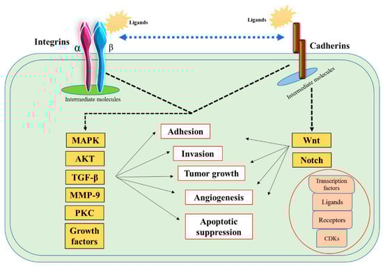 The structural and functional integration of cells with their surrounding cells and matrix takes place via various cell adhesion proteins apart from integrins and cadherins. These proteins can be divided into several functional groups such as structural proteins, adaptor proteins, focal adhesion proteins, cytoskeletal actin-binding proteins, and signaling proteins. Some of the molecules that fall within these groups include catenins, actin, actinin, talin, vinculin, and paxillin. These protein molecules localize to integrin mediated cell-extracellular matrix adhesion contacts as well as cadherin mediated cell-cell contacts, at cytoplasmic domain, bridging the adhesion molecules with cytoskeleton. Apart from playing a role in cellular processes and signal transduction pathways, they also contribute toward various diseases such as cancer [6,7,8,9,10,11,12,13,14,15]. For instance, paxillin, which is a multi-domain adaptor protein, is involved in essential processes such as embryonic development, wound repair, and tumor metastasis by binding to various signaling proteins associated with actin cytoskeleton organization [16]. The dysregulated expression of these molecules have shown to impair the functioning of cell adhesion molecules such as that of cadherins and integrins [17,18]. For example, in basal like breast cancers, increased expression of α-actinin-1 was found to be responsible for cell migration of mammary epithelial breast cancer cells as a result of destabilization of E-cadherin adhesion [18]. The expression of these additional cell adhesion proteins is diverse in breast cancer and influences stages of invasion, proliferation, progression, and metastasis [7,19,20]. Co-localization of vinculin with activated Akt was shown not only to promote tumor cell invasion but also contribute to extracellular matrix stiffness, which, in turn, promoted tumor progression in mammary epithelium [21]. Another study done on tumor samples from primary breast carcinoma showed a presence of paxillin, which is associated with upregulation of HER2. Furthermore, depending on the status of HER2, the response of chemotherapy targeting this adaptor protein varies [22]. From these and other studies, it can be inferred that, besides conventional treatment regimens such as surgery, radiations, and chemotherapy, which are less effective especially in metastatic stages of breast cancer, targeting these additional protein cell adhesion molecules may serve an essential gateway for more effective treatment strategies. Furthermore, the targeting can also enhance the chemosensitivity of the drugs to tumor cells, which, otherwise, show multiple drug resistance. For instance, reduced expression of talin-1 enhanced chemosensitivity of breast cancer cells to docetaxel drug, which proposes talin-1 as a potential therapeutic target [20]. Similarly, various molecules have been identified, which can disrupt dysregulated WNT signaling and catenin dependent transcription. This inhibits the growth of carcinoma cells [23]. In another study, knockdown of β-catenin in triple negative breast cancer (TNBC) cells enhanced the tumor cell sensitivity to doxorubicin and cisplatin drugs, which indicates the essential role of transcriptional activity of this catenin sub-unit for TNBC cell chemosensitivity. Therefore, this makes it a promising therapeutic target for this type of breast cancer [23].
