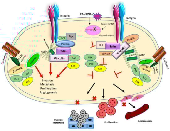 Various additional cell proteins play roles in localizing adhesion contacts of cadherins and integrins with actin filaments in the cytoplasm and communicate essential signal transduction. Their aberration plays a critical role in disrupting the signaling pathways and results in various diseases including breast cancer. Some of the essential molecules, which are critically involved in breast cancer, are catenins, actinin, talin, vinculin, and paxillin. Table 9 lists some of the essential pathways these molecules are linked with in various forms of breast cancer. Acting as intermediate molecules, these adhesion proteins are responsible for the cascade of metastatic pathways (Figure 17). Targeting these additional proteins could serve an essential therapeutic approach for breast cancer. However, in order to ensure the enhanced target delivery, the use of a suitable carrier vehicle is one of the key factors. In vitro and in vivo RNAi approaches are being applied to target these endogenous overexpressed genes using CA as a delivery vehicle for a release of siRNA at the target site. Furthermore, to see the effect of knockdown of the essential cell adhesion molecules, we performed a Western blot assay where we targeted AKT and MAPK pathways. Since AKT and MAPK pathways are predominantly responsible for regulating proliferation and survival of cancer cells, downregulation of the pathways also correlate with the induced cytotoxicity of the breast cancer cells.