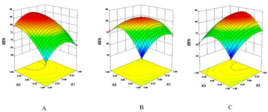 The EE% ranged from 59.32% to 84.11% in the 17 experiments. We built a fitting equation between factors and EE% by regression analysis of the results. The fitting equation between EE% and three factors was: EE% = 83.48 + 0.58X1+ 7.35X2+ 1.95X3 − 0.60X1X2 − 4.47X1X3 + 0.35X2X3 − 6.56X12 − 4.18X22 − 11.17X32.
