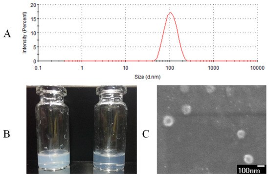 Characterization of vitamin D3 (VD3) liposomes. (A) The particle size of VD3 liposomes. (B) Morphological appearance of VD3 liposomes at 1 mg/mL and 100 μg/mL. (C) Scanning electron microscope (SEM) of VD3 liposomes at secondary electron imaging mode (×30,000).