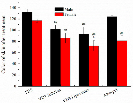 Color of rats’ skin after treatment. * p < 0.05, VD3 liposomes vs. VD3 solution for female rats; ## p < 0.01, VD3 solution, VD3 liposomes or aloe-gel vs. PBS for male and female rats.
