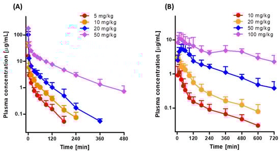 Mean arterial plasma concentration-time profiles of tofacitinib in Sprague-Dawley rats after (A) 1-min intravenous infusion of 5 (n = 9), 10 (n = 8), 20 (n = 7), and 50 (n = 7) mg/kg tofacitinib and (B) oral administration of 10 (n = 7), 20 (n = 8), 50 (n = 9), and 100 (n = 7) mg/kg tofacitinib. Bars represent standard deviations (SD).