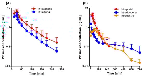 Mean arterial plasma concentration-time profiles of tofacitinib in Sprague-Dawley rats after (A) 30-min intravenous (n = 7) and intraportal (n = 7) infusions of 10 mg/kg tofacitinib and (B) 30-min intraportal (n = 6) infusion, and intraduodenal (n = 5) and intragastric (n = 5) instillations of 10 mg/kg tofacitinib. Bars represent standard deviations (SD).