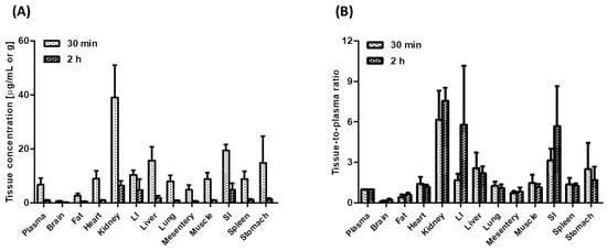 Figure 4 shows the concentrations of tofacitinib in plasma (μg/mL) and in tissue samples (μg/g) and its tissue-to-plasma (T/P) ratios 30 min (distribution phase) and 2 h (elimination phase) after intravenous administration of 10 mg/kg tofacitinib. Tofacitinib was widely distributed in all rat tissues, with T/P ratios greater than 1.0 in every tissue except the brain, mesentery, and fat, both 30 min and 2 h after intravenous administration. At 30 min, tofacitinib was exclusively distributed in the kidneys, small intestine, and large intestine, with its concentrations remaining stable until 2 h after intravenous administration.