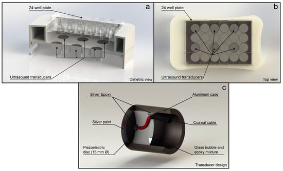 Ultrasound treatment chamber and transducer design used to treat the cells. (a) Cutaway of the dimetric view of ultrasound treatment chamber showing the distance. (b) Top view of the chamber showing which cell culture wells were exposed to ultrasound. (c) Cutaway of the transducer design used in the ultrasound treatment chamber.