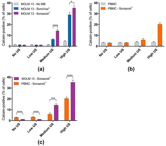Increasing the ultrasound intensity and the addition of microbubbles significantly increased the percentage of calcein-positive cells. (a) Percentage of calcein-positive MOLM-13 cells versus ultrasound intensity. Increasing the ultrasound intensity correlated to an increase in calcein positive cells. The addition of microbubbles significantly increased the calcein-positive population. At medium and high ultrasound intensities Sonazoid™ was significantly better than SonoVue®. (b) Percentage of calcein positive peripheral blood mononuclear cells (PBMCs) versus ultrasound intensity. Ultrasound alone did not increase the calcein-positive population. The addition of Sonazoid™ significantly increased the calcein-positive population at medium and high ultrasound intensities. (c) Comparison of calcein-positive population between MOLM-13 cells and PBMCs. At medium and high ultrasound intensities a significantly larger population of the MOLM-13 cells were calcein positive. * = p < 0.05, ** = p < 0.01, *** = p < 0.001, **** = p < 0.0001 (Significance depicted for Sonazoid™ vs. SonoVue®, and MOLM-13 vs. PBMC. All p-values can be found in Tables S2–S5).
