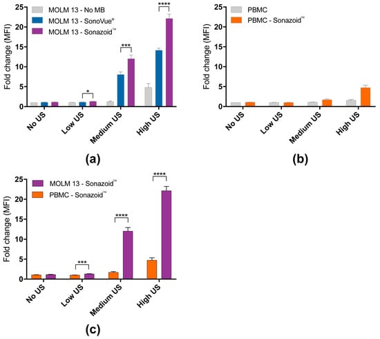 Sonoporation induced significant increase in uptake of model drug calcein in sonoporated cells measured by median fluorescence intensity. (a) Fold change of median fluorescence intensity (MFI) in MOLM-13 cells affected by sonoporation (=calcein-positive cells). The increase in calcein uptake depended on addition of microbubbles and ultrasound intensity. Use of Sonazoid resulted in significantly higher increase in uptake than SonoVue at all three ultrasound intensities. (b) Fold change of median fluorescence intensity (MFI) in calcein-positive PBMC. The uptake is significantly dependent on addition of microbubbles and ultrasound intensity (significant increase in uptake only seen at high ultrasound intensity). (c) Comparison of calcein uptake between MOLM-13 and PBMC. A significantly higher percentage of cancerous MOLM-13 cells were affected than healthy PBMC at all 3 ultrasound intensities. * p < 0.05, ** p < 0.01, *** p < 0.001, **** p < 0.0001 (Significance depicted for Sonazoid™ vs. SonoVue®, and MOLM-13 vs. PBMC. All p-values can be found in Tables S2–S5).
