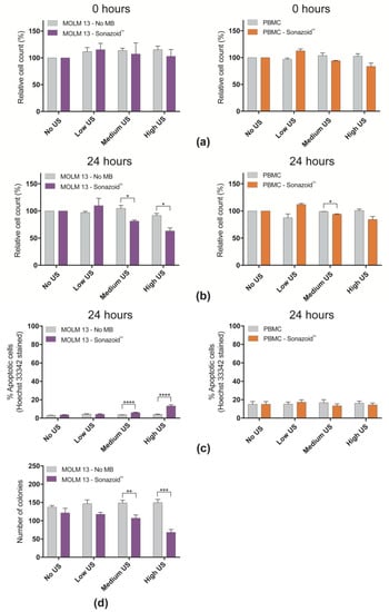 The cell count was measured immediately after sonoporation to determine if the mechanical forces lead to any immediate cell damages from the treatment. Cell lysis or immediate necrosis was only observed at much higher acoustic intensities than those evaluated in this study, (i.e., MI = 0.6, ISPTA = 2673mW/cm2, Duty Cycle = 20%). No significant changes in total cell counts were observed for either MOLM-13 or PBMCs at any of the ultrasound intensities when compared to controls not treated with ultrasound (Figure 4a,d, Tables S2 and S3). However, a small increase in cell count was observed using low ultrasound without microbubbles at both 0 and 24 h compared to untreated cells. After 24 h a significantly lower cell count was observed in MOLM-13 cells treated with medium and high ultrasound with the addition of microbubbles (Figure 4b, Tables S2 and S3). In PBMCs a modest, but statistically significant, decrease in cell count after 24 h was observed at medium ultrasound with microbubbles (p < 0.05) (94% and 99% cells relative to untreated cells, respectively). To elucidate if the reduced cell count of MOLM-13 was a result of increased cell death or reduced proliferative ability, Hoechst 33342 staining and colony forming assay were performed. The addition of microbubbles and application of medium or high US increased the percentage of apoptotic MOLM-13 cells to 6% and 13% respectively (Figure 4c, Tables S2 and S3). Upon Hoechst staining of PBMCs, no significant change in apoptotic cells was observed at any treatment regime. Colony forming assays (Figure 4d, Tables S2 and S3) demonstrated that MOLM-13 cells formed significantly less colonies at medium and high ultrasound intensity + microbubbles (77% and 50% fewer colonies, respectively).