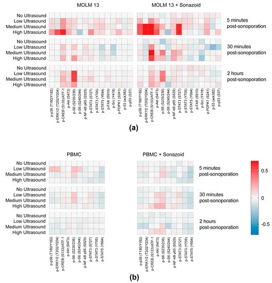 Intracellular signaling profiles of sonoporated cells. (a) Heatmaps displaying changes in phosphorylation status in MOLM-13 of the chosen range of proteins in response to treatment with ultrasound with and without SonazoidTM microbubbles. Phosphorylation status was detected 5 min, 30 min and 2 h post sonoporation (mean of Arcsinh ratios) (b) Heatmaps displaying changes in phosphorylation status in PBMC of the chosen range of proteins in response to treatment with ultrasound with and without SonazoidTM microbubbles. Phosphorylation status was detected 5 min, 30 min and 2 h post sonoporation (mean of Arcsinh ratios).