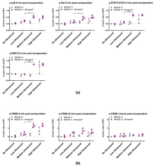 Significant changes in phosphorylation were observed for p38, ERK1/2, CREB, Akt and STAT3 (S727) in MOLM-13 cells. The increases in phosphorylation primarily occurred when increasing ultrasound from low to medium. (a) Scatter plots of results 5 min post sonoporation from 3 individual experiments. Phosphorylation status of p38, ERK1/2, Akt and STAT3 (S727) were transiently altered from untreated controls at medium and high ultrasound intensity in the presence of microbubbles. (b) Scatter plots of results at 5 min, 30 min and 2 h from 3 individual experiments. Phosphorylation status of CREB was altered by sonoporation for up to 2 h. * p < 0.05, ** p < 0.01, *** p < 0.001, **** p < 0.001 (Significance depicted for Low ultrasound vs. Medium ultrasound. All p-values can be found in Tables S2–S5).