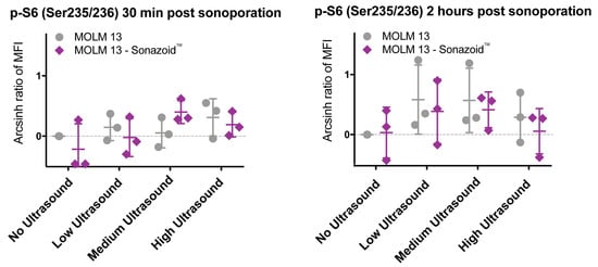 Changes in phosphorylation as observed for ribosomal protein S6 in MOLM-13 cells, shown as scatter plots of results at 30 min and 2 h from three individual experiments. The trend is an increase in phosphorylation at low and medium ultrasound intensity both with and without microbubbles, which is reduced at high ultrasound intensity. Changes in phosphorylation of ribosomal protein S6 at Ser 235/236 were not significant. This is probably due to high variation in results between experiments.