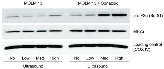 Eukaryotic initiation factor 2 alpha (eIF2α) signaling may have an inverse relationship to mTOR/S6 signaling [], and to elucidate the downstream mechanism the phosphorylation status of eIF2α was investigated. The Western blot in Figure 8 shows that eIF2α was phosphorylated 2 h post sonoporation in MOLM-13 when exposed to medium and high ultrasound intensity with addition of microbubbles. The phosphorylation of eIF2α was increasing from medium to high ultrasound (+ microbubbles).