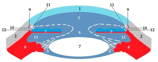 Pathways of aqueous humor outflow are indicated with arrows. 1—cornea; 2—sclera; 3—anterior chamber; 4—pupil; 5—iris; 6—ciliary body; 7—lens; 8—suspensory ligament; 9—Schlemm’s canal; 10—trabecular meshwork; 11—trabecular route; 12—uveoscleral route; 13—posterior chamber.