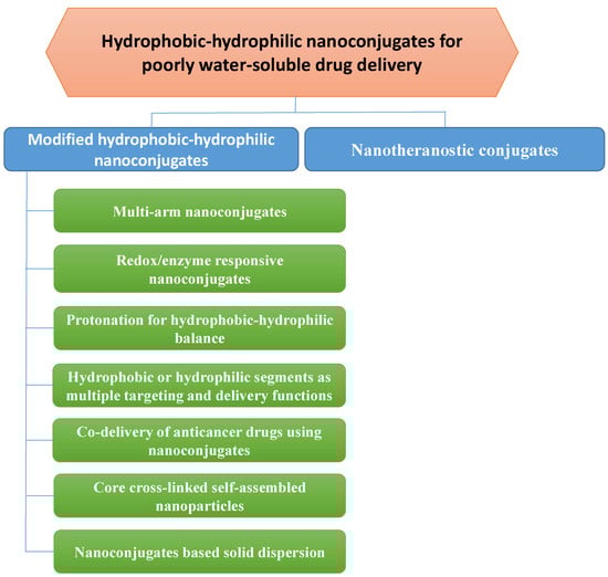 Although the use of hydrophilic polymers in solid dispersion, that is, the dispersion of a drug molecule in a carrier, has been established for improving drug dissolution and solubility since 1960 [14,15,16,17,18,19,20], hydrophilic–hydrophobic polymer nanoconjugates and hydrophobic drug-hydrophilic polymer nanoconjugates have been studied for loading drugs into nanoparticles for the same purposes in the past few decades of nanotechnological development [21,22,23]. The conjugation can commonly induce the formation of self-assembled polymeric amphiphiles, i.e., the exposure of this structure to aqueous environments results in self-assembled nanoparticles with hydrophobic segments in the inner core and hydrophilic segments towards the aqueous environment [9,24,25]. Consequently, the size of poorly water-soluble drugs is reduced to nanosize, leading to enhanced dissolution. Crystalline drug structure and drug-polymer interactions will be noted in addition to certain recent studies, as these factors may facilitate drug dissolution to improve bioavailability. With regard to theranostics systems for poorly water-soluble drugs, numerous nanoconjugate studies have been performed in cancer research [26,27]. In addition to the preferential accumulation of drug nanosized particles in tumours due to the leaky and porous structure of the tumoural blood vessels, nanoparticles may prolong the half-life of the drug in the blood circulation and specifically target a tumour by their surface decorations. However, conventional conjugations between hydrophilic molecules and hydrophobic molecules often encounter limitations such as low drug solubility, low drug loading, single drug delivery, large particle size, and short half-life, which may lead to unpredictable treatment efficacy. This review summarizes the current conjugation strategies for nanoparticulate formulations, suggesting efficient solutions to overcome these limitations and introducing specific applications of poorly water-soluble drugs (Figure 1).