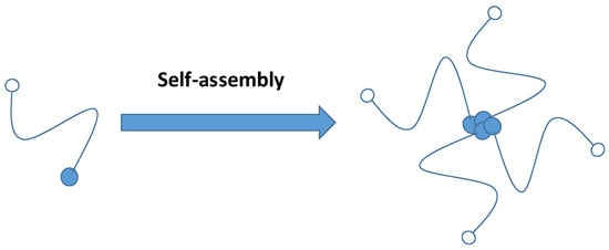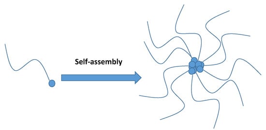 Illustration of self-assembled nanoparticles from hydrophobic–hydrophilic nanoconjugates. The blue dot represents the hydrophobic association.