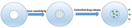 Illustration of core-crosslinked nanoconjugate for controlled drug release [92]. The green dots represent the drug molecules.