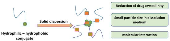 Solid dispersion is a technique in which poorly water-soluble drugs are dispersed in hydrophilic carriers [20,96,97]. Although hydrophilic carriers can prevent drug recrystallization, drug crystals cannot always be transformed into amorphous forms due to the drug’s structure or polymer type. Ngo et al. suggested using hydrophilic–hydrophobic blends to overcome this limitation [98]. Furthermore, Dinh et al. developed a hydrophilic–hydrophobic conjugate using a carrier in solid dispersion to improve drug bioavailability [59] (Figure 5). This conjugate was demonstrated to be a potential carrier because it can induce a molecular interaction, reducing drug particles and changing drug crystals in solid dispersion [59,60].