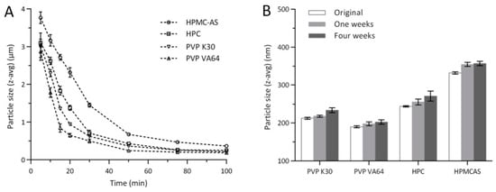 Particle size distributions during (A) milling process and (B) short-term storage process of celecoxib nanocrystalline (CLX-NC) containing different polymer stabilizers (mean ± SD, n = 3).