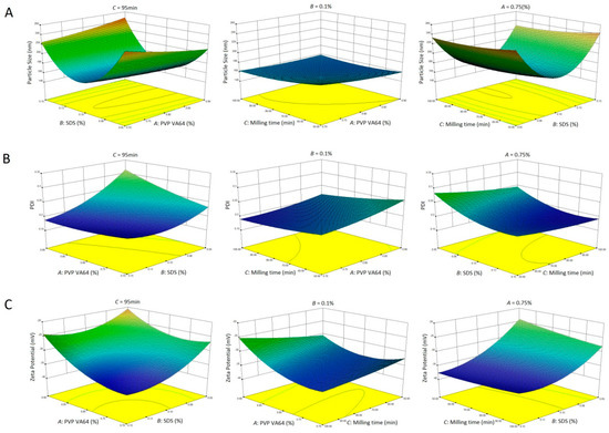 The three-dimension response surface plots were used for better evaluation of the factor effects on the CQAs. Figure 2 presents the effect of the interactions between different formulation and process factors on particle size (Y1, Figure 2A), PDI (Y2, Figure 2B), and zeta potential (Y3, Figure 2C) of CLX-NC. In case of Y1, response surface plot (Figure 2A) showed that when low SDS concentration was used for milling, the increase of amounts of PVP VA64 could lead to more efficient particle size reduction, probably because more supplement of polymer stabilizer was necessary to maintain the desired stabilization in the absence of ionic stabilizer. However, when high SDS concentration was used, more polymers caused the slight growth of CLX-NC particle size. It could be attributable to the increased viscosity of the suspension caused by additional polymers. Response surface plots of response Y1 and Y2 exhibited a relative high similarity. In Figure 2B, it was clearly revealed that more narrow particle size distribution was achieved with more milling times and higher ionic stabilizer concentration. In case of Y3, Figure 2C exhibited that zeta potential of CLX-NC formulation was decreased on increasing ionic stabilizer concentration. In contrast, a rising trend of zeta potential was observed on increasing polymer concentration. This phenomenon has been reported by Ahuja et al., and has beenattributed to the increased adsorption of polymer onto drug surface resulted in a decrease of absolute value of zeta potential [29].
