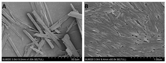 Scanning electron microscope (SEM) images of (A) CLX crude powder and (B) optimized CLX-NC.