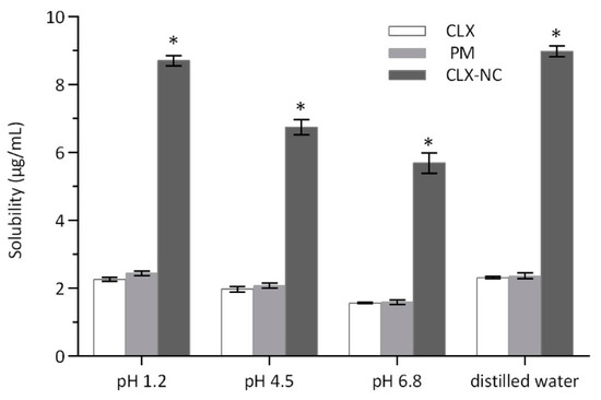 Apparent solubility of CLX crude powder, PM and optimized CLX-NC in different dissolution media (mean ± SD, n = 3). * implies significant at p ≤ 0.05 compared to CLX crude powder.