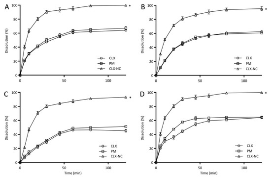 In vitro dissolutionprofiles of CLX crude powder, PM and optimized CLX-NC in different dissolution media (A: pH 1.2, B: pH 4.5, C: pH 6.8 and D: distilled water) (mean ± standard deviation (SD), n = 3). * implies significant at p≤0.05 compared to CLX crude powder.