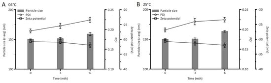 In order to evaluate the physical stability, the performance parameters such as particle size, PDI, and zeta potential of optimized CLX-NC during storage for six months at 4 °C and 25 °C were detected and are shown in Figure 9. The particle size of optimized CLX-NC was found to be stable at end of three months and appeared a slight increment after six months at both temperatures. However, the increment was statistically insignificant (p>0.05) when compared to those at an initial time. In spite of exhibiting continuous increase, the PDI of optimized CLX-NC during six months’ storage still retained below 0.25, indicating a narrow particle size distribution [33]. The particle size distributionof CLX-NC shown in Figure S5indicated that there is still one peak and no secondary peaks were observed aftersix months’ storage. Furthermore, the absolute zeta potential values during storage at both temperatures remained higher than 30, which was important to prevent aggregation of drug particles by electrostatic effect [34]. These results suggested optimized CLX-NC had a remarkable stability. This stability should be attributed to the presence of PVP VA64 and SDS, which served as an inhibitor of drug particle growth by adsorbing onto the surface of the drug nanoparticles.