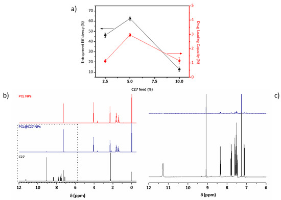The resulting PCL@C27 nanoparticles were analyzed and the data of encapsulation efficiency (EE%) and drug loading capacity (DLC%) determinations are summarized in Figure 2a (detailed information in the Supplementary Materials).