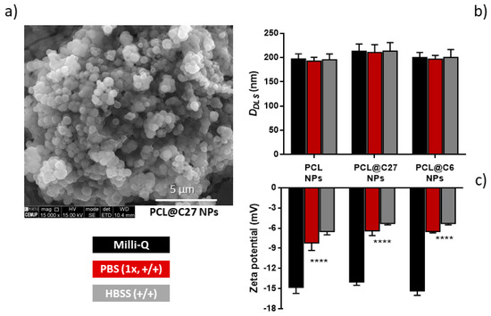 The PCL@C27 nanoformulation presented NPs with a spherical shape and a uniform size distribution (Figure 4a), although some aggregation, probably due to the drying process, was observed. The hydrodynamic size (DDLS) and zeta potential (z-potential) of C27-loaded and unloaded PEGylated PCL NPs were assessed in three different conditions: Milli-Q water, phosphate-buffered solution with calcium and magnesium (PBS 1×, +/+), and Hank’s balanced salt solution with calcium and magnesium (HBSS +/+) (Figure 4b,c). Although particle characterization measurements are commonly conducted in Milli-Q water [43], the morphology and surface charge of NPs were also evaluated in PBS and HBSS, the mediums used in drug-controlled release and cell-based studies, respectively.