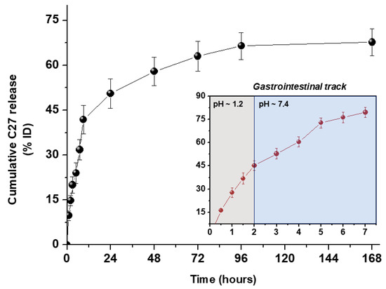 The in vitro release studies in gastrointestinal simulated fluids (inset of Figure 5) make it possible to conclude that the C27 release is accelerated in acidic medium, in a process probably related to a faster degradation of PCL. Comparing the data obtained in both media in the first 2 and 7 h, a circa 3- and 2.5-fold increase of C27 release was observed in the acidic medium, respectively. This data is in good agreement with data previously reported by our group related to the release of a coumarin-based compound from PEGylated PLGA NPs [8].