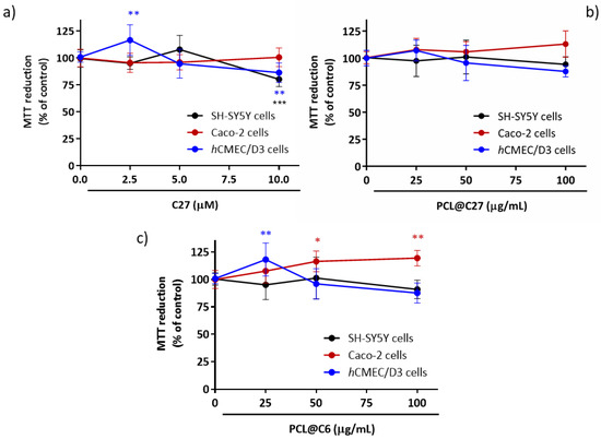 Cytotoxicity profile of C27 at 2.5, 5, and 10 µM (a) as well as nanoformulations of PCL@C27 (b) and PCL@C6 NPs (c) at 25, 50, and 100 µg/mL in different cells lines, evaluated by the MTT reduction assay 24 h after exposure. Results are expressed as mean percentage of MTT reduction ± SD of three independent experiments. In all cases, p-values lower than 0.05 were considered significant (* p < 0.05, ** p < 0.01, *** p < 0.001 versus control cells).