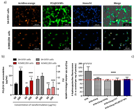 The capacity of PCL NPs to be internalized in SH-SY5Y and hCMEC/D3 cells was determined using a fluorescent probe (coumarin C6) encapsulated inside PCL NPs (PCL@C6 NPs) and measured by fluorescence spectroscopy. After incubation with PCL@C6 NPs at 50 and 100 μg/mL (conditions described in cell viability analysis section), cells were washed thrice with fresh HBSS (+/+) to remove the excess of PCL@C6 NPs. Then, HBSS (+/+) was added and the intracellular fluorescence assessed in a multi-well plate reader (excitation and emission wavelengths at 485 and 528 nm, respectively). For the intracellular localization, after treatment with PCL@C6 NPs (50 μg/mL), cells were washed thrice with fresh HBSS (+/+) and treated with 5 µg/mL of Hoechst 33,342 for 30 min at 37 °C in the dark. Afterwards, the cells were washed twice with fresh HBSS (+/+) and images were captured with an automated microscope (Lionheart FX, BioTek, Winooski, VT, USA). After this, the images were superimposed to determine the intracellular localization of the NPs.